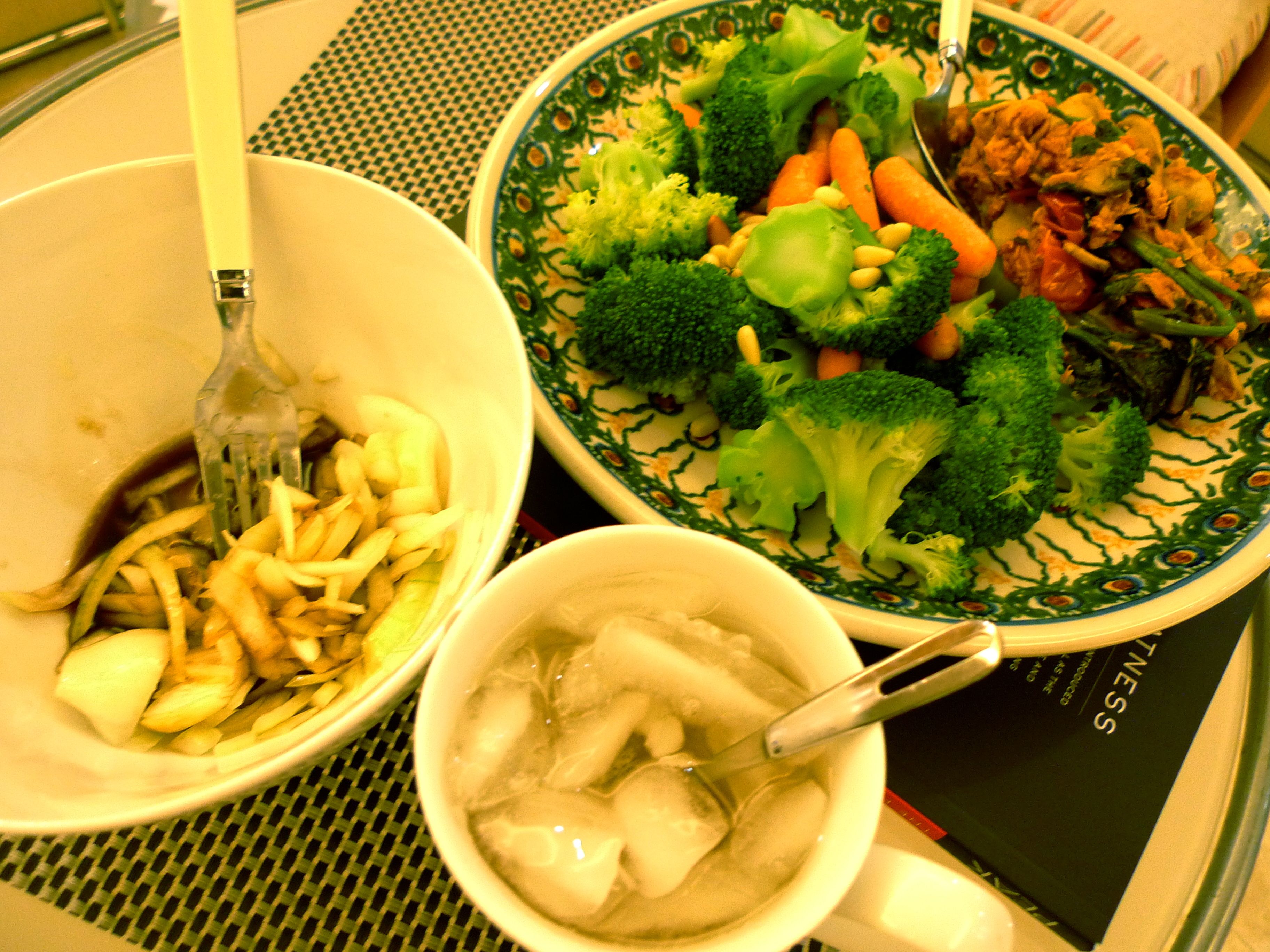Steamed Broccoli (a whole head) with baby carrots and sprinkled with pine nuts. Leftover tuna-spinach-mushroom-tomato salsa from last night.
