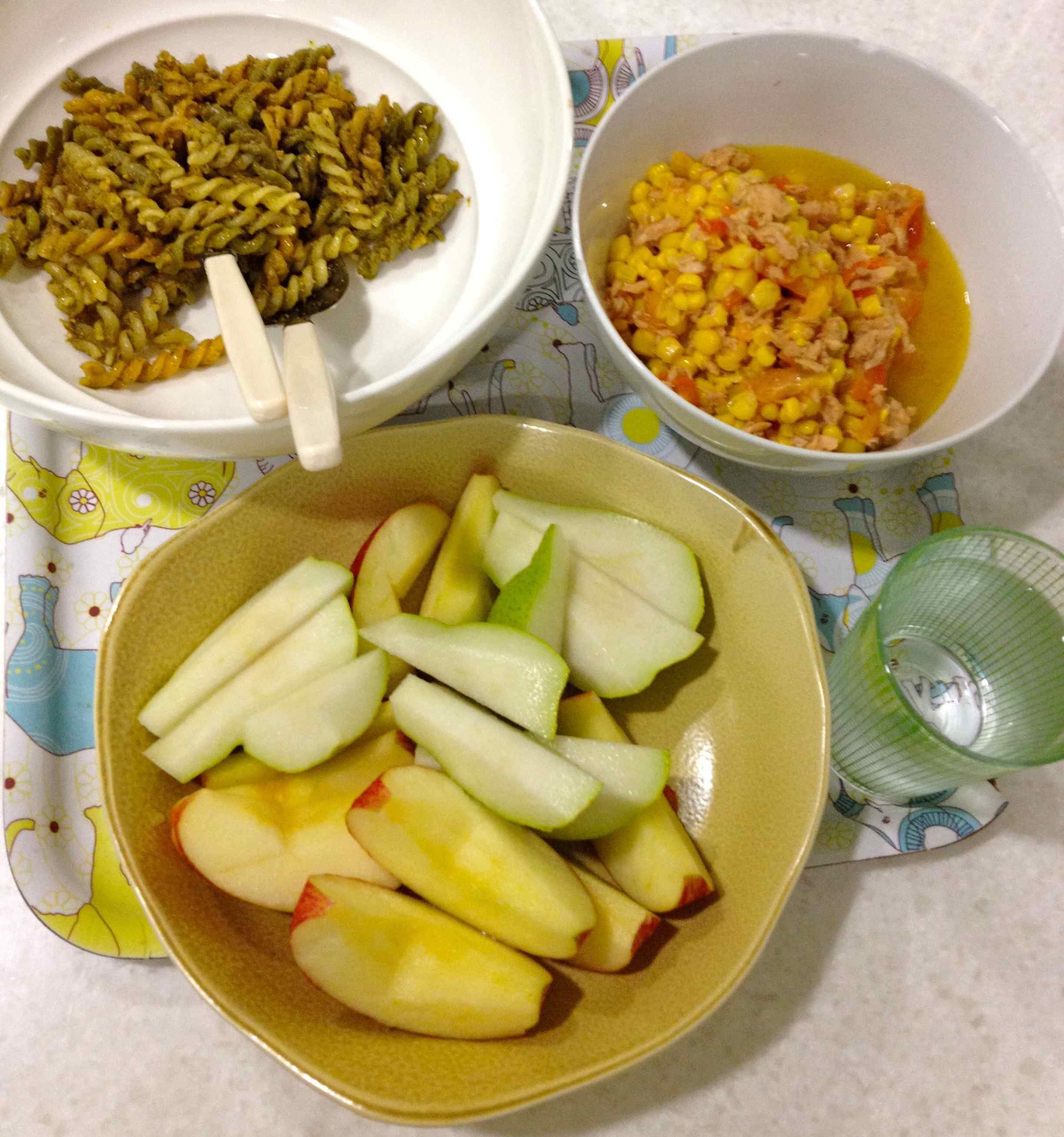 At home, made some pesto pasta (been craving this for a while). Then for protein, tuna, tomato, corn mixture, and 1 apple and 1 pear for dessert. And 1 cup of water.