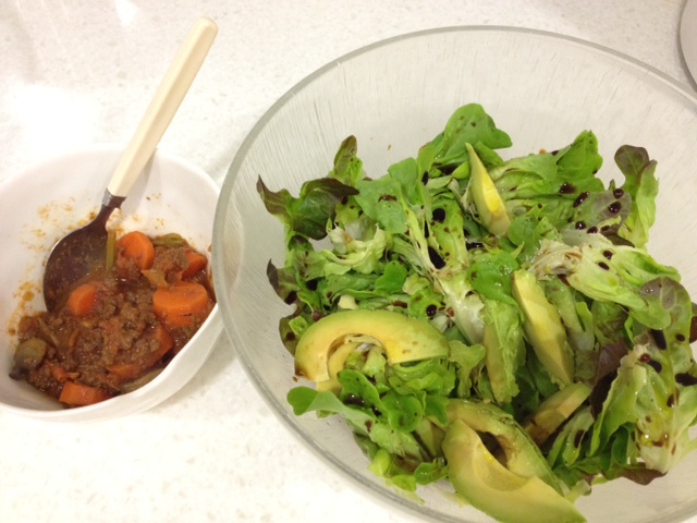 Came home and heated up some bolognaise sauce and had it with oak leaf salad with avocado and simple olive oil and balsamic vinegar dressing. Really enjoyed my dinner! Then another 2 apricots and a pear.