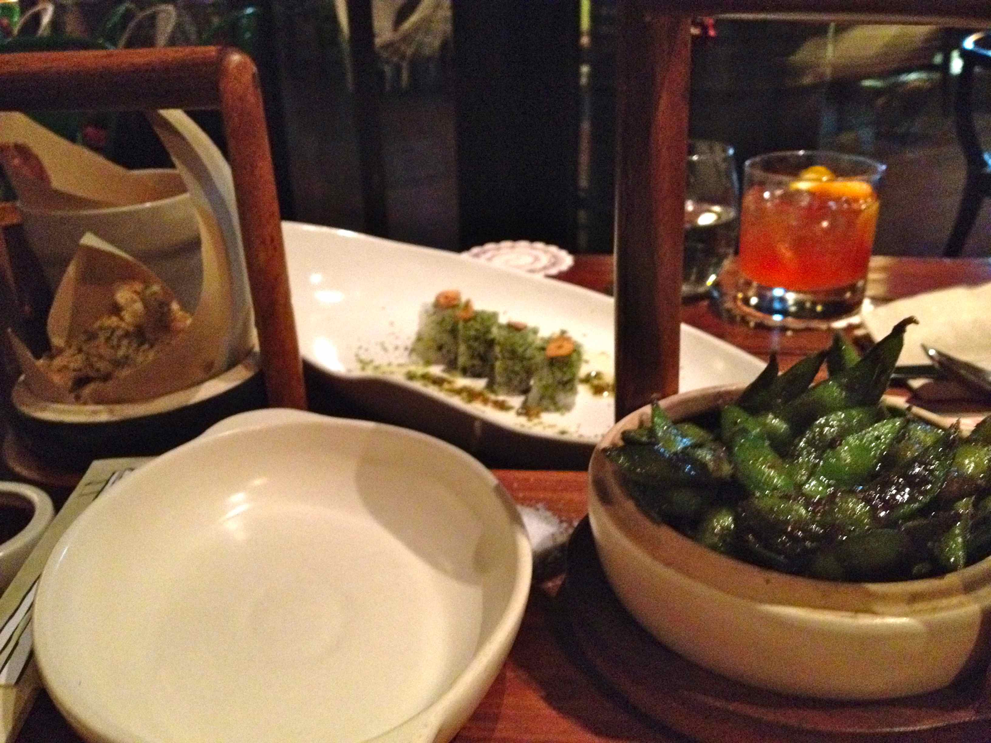 A kimchi hot pot, 1 serving shishamo, 1 serving edamame, 1 serving maki, 1 serving of gyoza, 1 serving of chicken cartilage, 1 serving ginko, 1 serving mixed teppan vegetables and 1 serving baked brinjal.
